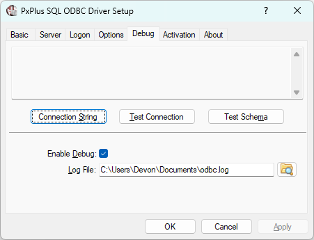 The Debug option traces active sessions within the PxPlus SQL ODBC Driver and generates a log file. This reports internal diagnostic information that is different from the SQL tracing provided by the Microsoft ODBC Driver Manager.