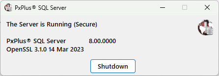 When run interactively, a dialog will display, stating that the PxPlus SQL Server is running. If SSL is enabled, the word "(Secure)" is included at the end of The Server is Running message. The dialog also includes the PxPlus SQL Server and OpenSSL version information. A Shutdown button is provided to allow you to shut down the server.
