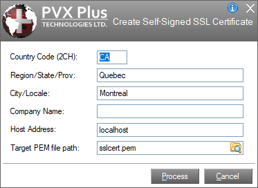 This screen will be pre-populated with your current Country (2-character code), Region, City, Host Address (default is localhost) and Target PEM (default file name is sslcert.pem). Enter/adjust the fields as desired and then click the Process button to request the certificate. Upon completion, the target file will contain the desired certificate.