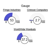 Gauge charts display each set of data provided as a gauge, which by default ranges from 0 to 100. This range can be changed by setting RangeMax and RangeMin properties. By default, the current value is shown as a blue band. The color of the band can be changed dynamically by specifying Green, Yellow and Red settings defining ranges where the color will change. For example, if you set the redFrom property to 80 and the redTo property to 100, the band will go red should the value be >= 80.