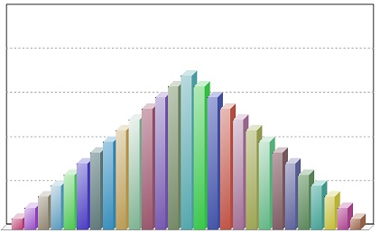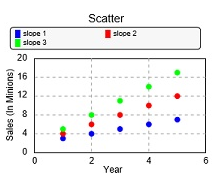 Charts generally consist of a series of point values, which may be grouped into multiple sets. By default, the point values are drawn on the chart grouped by sets with each having a different color. For example, you might have four point values representing sales for the last four years and these may be grouped by a client. In this case, each set of points would represent a specific client's sale for the past four years. This type of arrangement can be seen in the Bar and Column charts shown above.