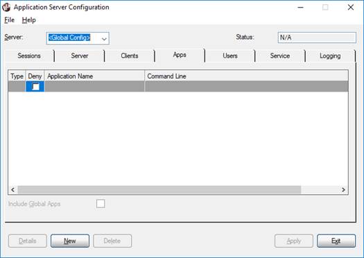 Application servers are created and maintained from the main panel of this utility. This panel is divided into several tabbed panels for viewing and/or changing different configuration and administration options: Sessions, Server, Clients, Apps, Users, Service and Logging.